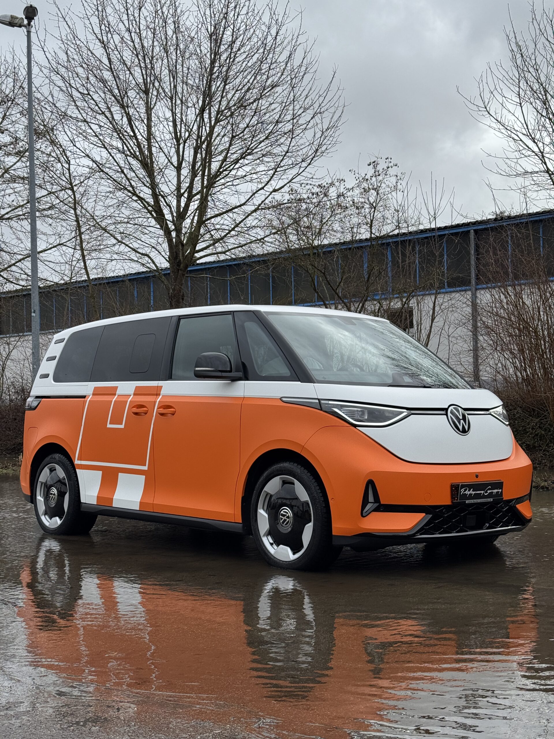 Gemeinsam mit dem Kunden haben wir uns für eine klare, moderne Zweifarboptik entschieden. Oben mattweiß, unten mattorange. Ein Design, das sofort ins Auge fällt, aber trotzdem seriös und professionell wirkt. Gerade bei einem Fahrzeug wie dem ID Buzz GTX passt diese Kombination perfekt zur Form und zur Präsenz auf der Straße.